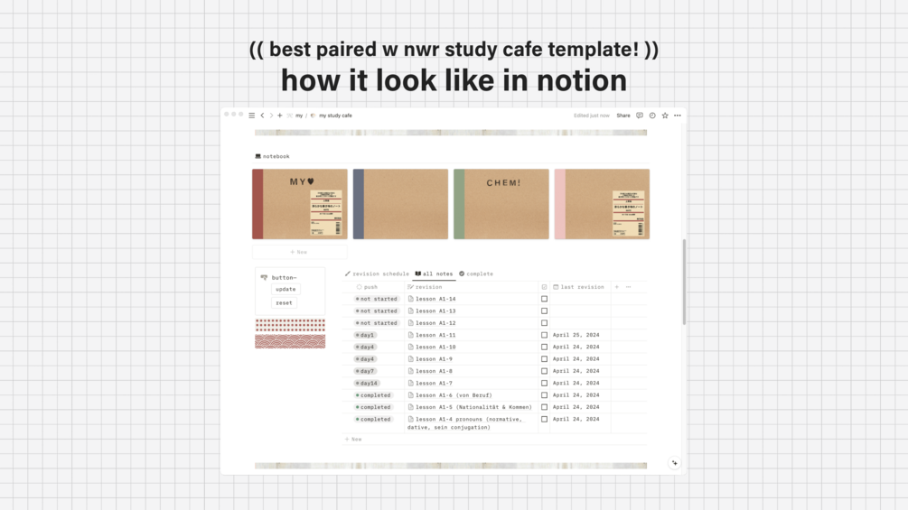 Muji-inspired notebook covers and stickers for those who want an analog feel in their Notion workspace and aim to make their setup more aesthetic. Best-paired with our Virtual Study Cafe Template! Stay organised, be productive, and reach for the โ๏ฝกยฐโฉ