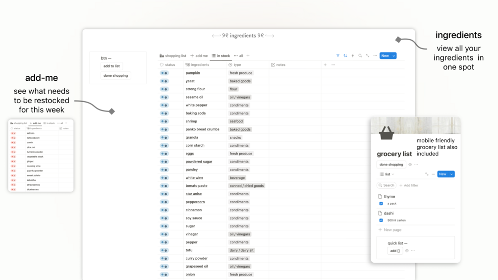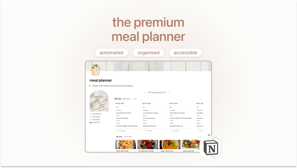 This Notion template helps you organise recipes, automate your grocery lists, and streamline your meal-planning routines. Thoughtfully crafted to simplify your meal planning and bring a sense of ease to your daily nourishment.